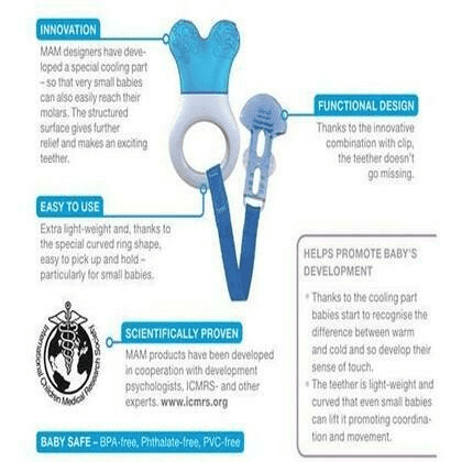 Unique shape reaches back teeth perfectly. Cools & calms. Biting structures massage sensitive gums.