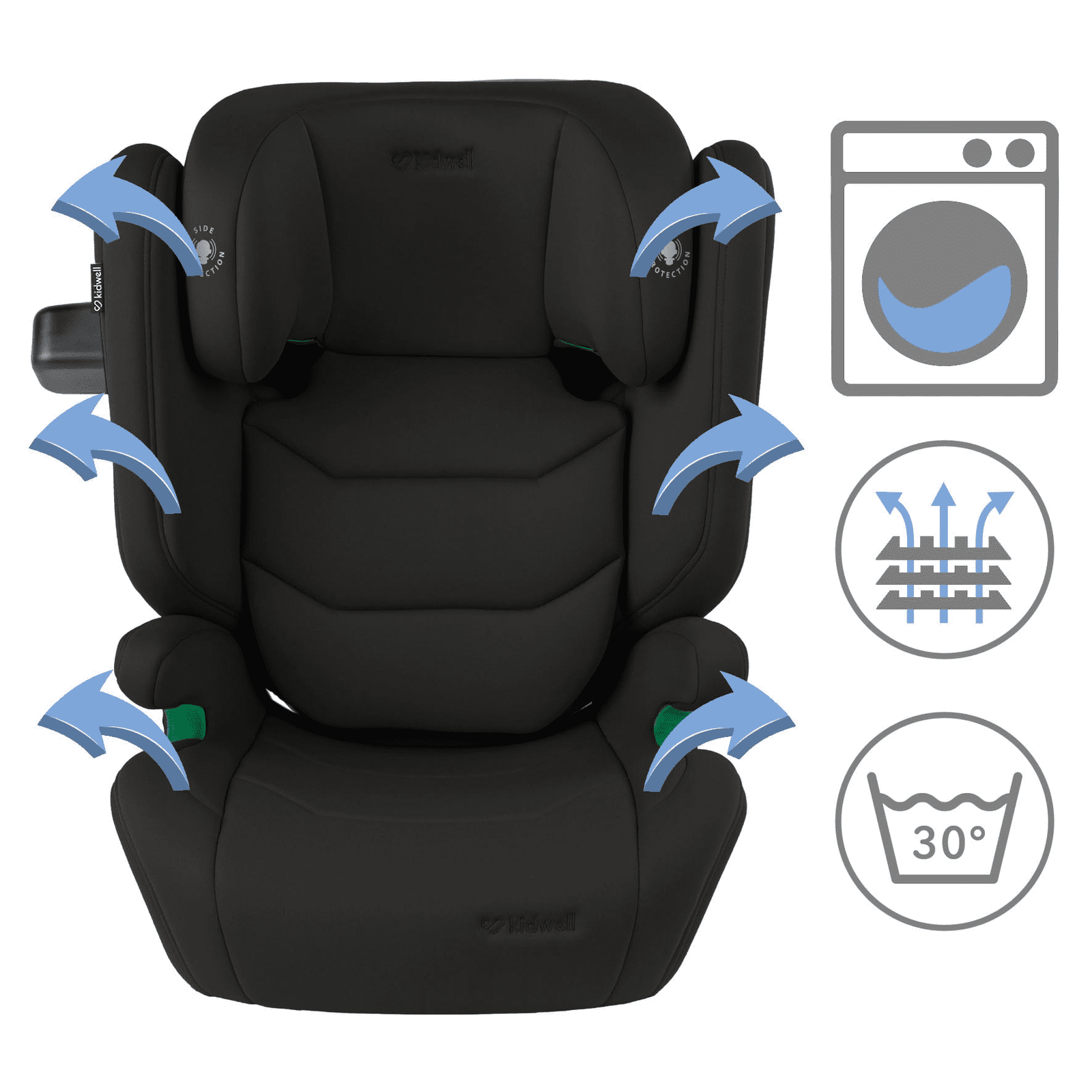 Maximum stability and safety are achieved by clicking the seat into the ISOFIX anchor points. Combining two systems—ISOFIX and seat belts—helps reduce the forces acting on the child during an accident. ISOFIX guides are included in the set to make installation even easier.